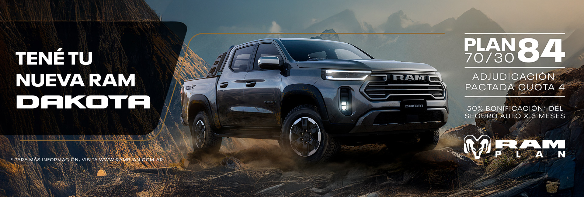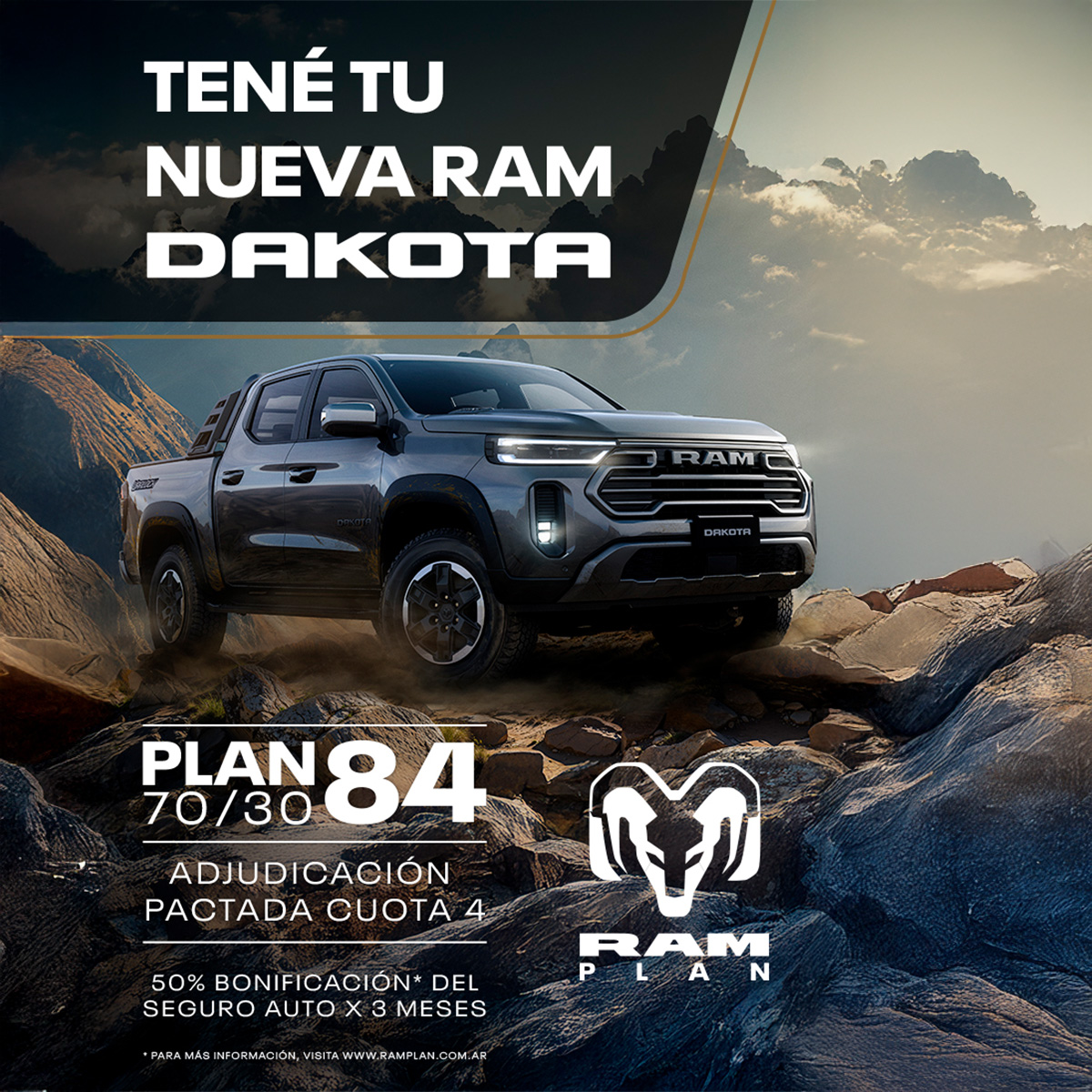 RAM Plan te ofrece una gama de modelos de suscripción con el fin de facilitar la formación de grupos; cuando resultás adjudicado podés optar por retirar cualquier versión de la gama que comercializa RAM® (vigentes para Plan de Ahorro al momento de la adjudicación), abonando de contado o financiando la diferencia. Antes de adquirir tu vehículo, confirmá con tu concesionaria la validez de las informaciones. RAM® se reserva el derecho de cambiarlo y/o cancelarlo total o parcialmente en cualquier momento, sin aviso y/o comunicación, sea por razones técnicas y/o comerciales, eliminando, cancelando y/o sustituyendo productos y las respectivas características, así como servicios y garantías.